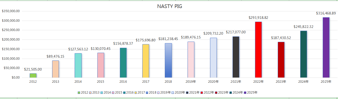From an initial annual order value of only $21,505 in 2012, NASTY PIG achieved over 15 times growth, reaching over $310,000 by 2025.