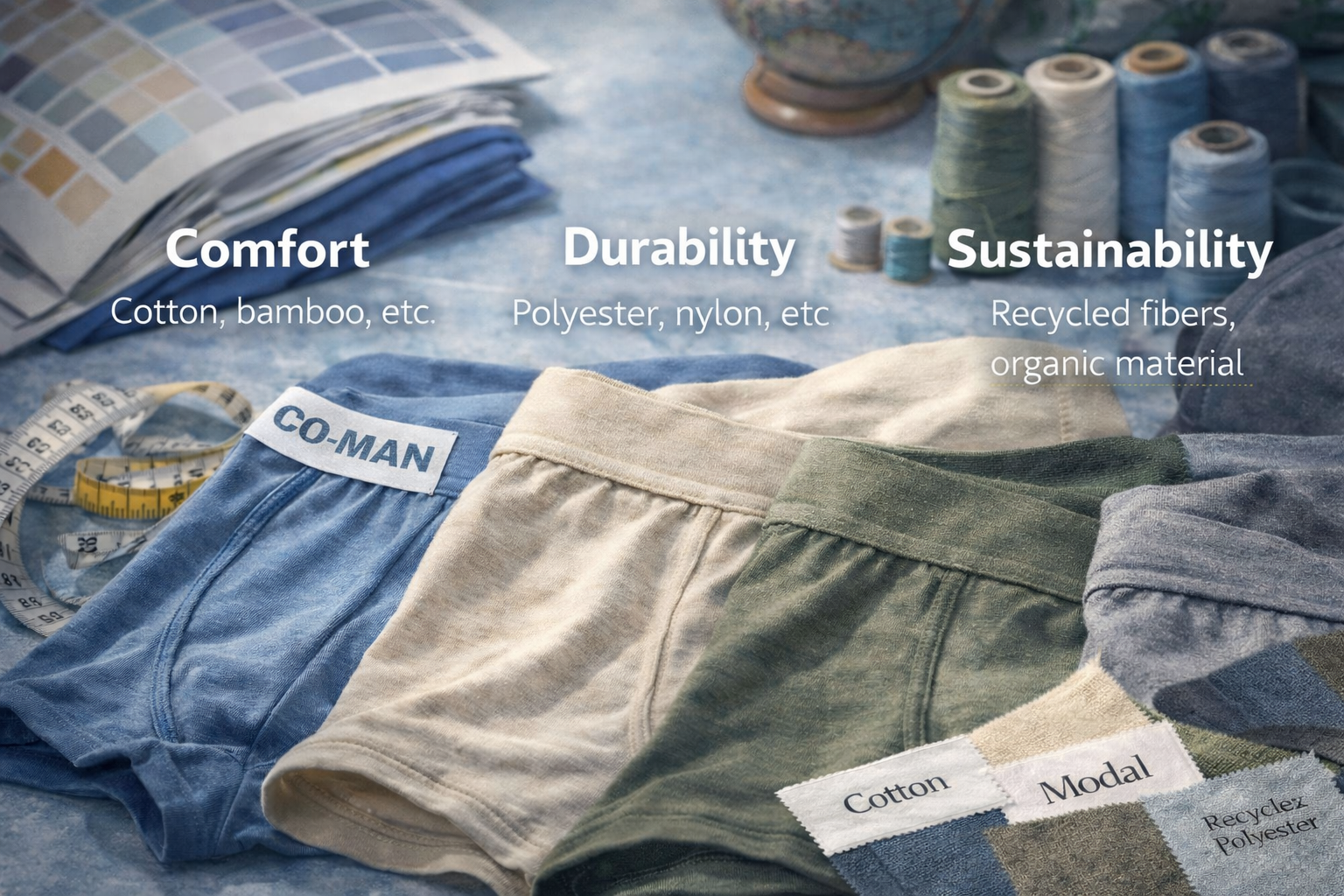 CO-MAN supports brands with end-to-end customization capabilities, from stable fabric sourcing to precise pattern cutting and fit optimization. With a wide selection of cotton, bamboo, modal, and functional blends, CO-MAN ensures material availability and consistency for bulk production. Our experienced technical team fine-tunes waistband construction, pouch structure, and sizing systems to deliver reliable fit and comfort across repeat orders.